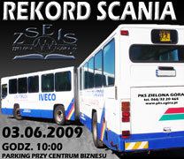 Dnia 3.06.2009r. o godzinie 10.00 na parkingu przy Centrum Biznesu w Zielonej Górze odbędzie się próba bicia rekordu Guinnessa polegająca na wejściu jak największej ilości "pasażerów" do autobusu typu scania cn 112. Do podstawionego pojazdu wchodzić będą zgłoszeni uczniowie Zespołu Szkół Elektronicznych i Samochodowych oraz zaproszeni gimnazjaliści.